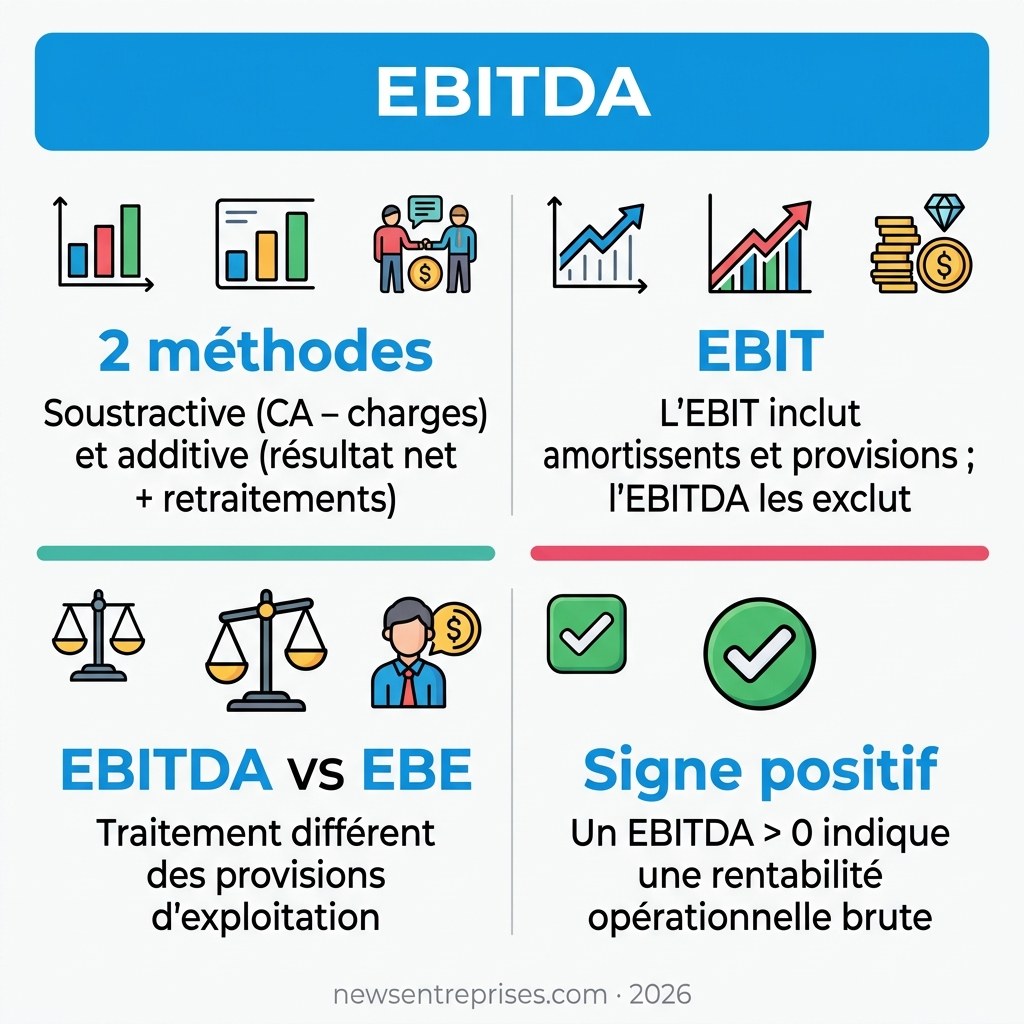 Pourtant, une divergence subsiste concernant les provisions d’exploitation. L’EBE adopte une posture souvent plus restrictive que l’EBITDA international. Ce dernier intègre certaines dotations d’exploitation dans sa structure de calcul.